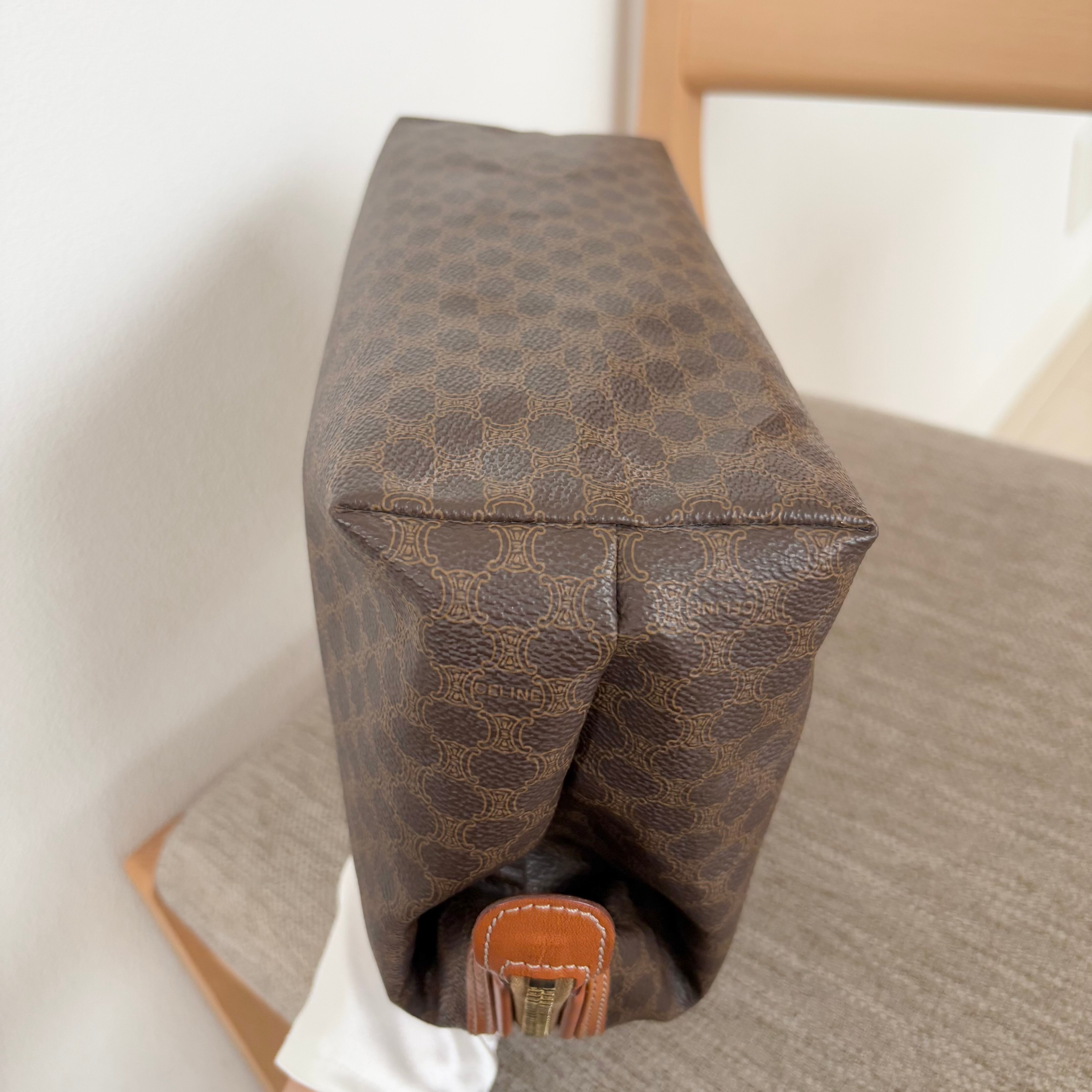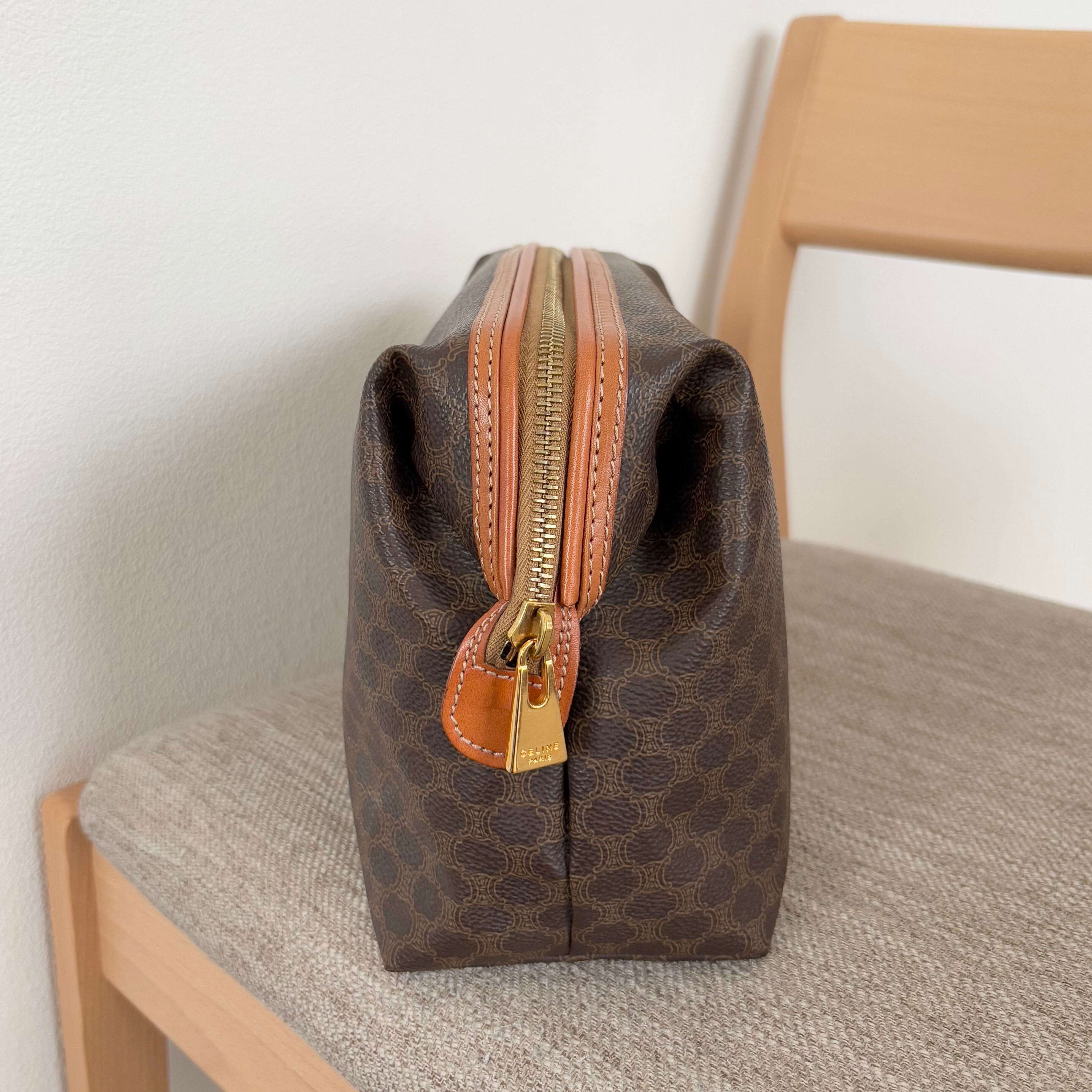 Celine セリーヌ マカダム コスメポーチ 小物入れ PVC カーフ レザー バック 本革 ショルダー バッグ ブラウン系 ゴールド金具 肩掛け かばん