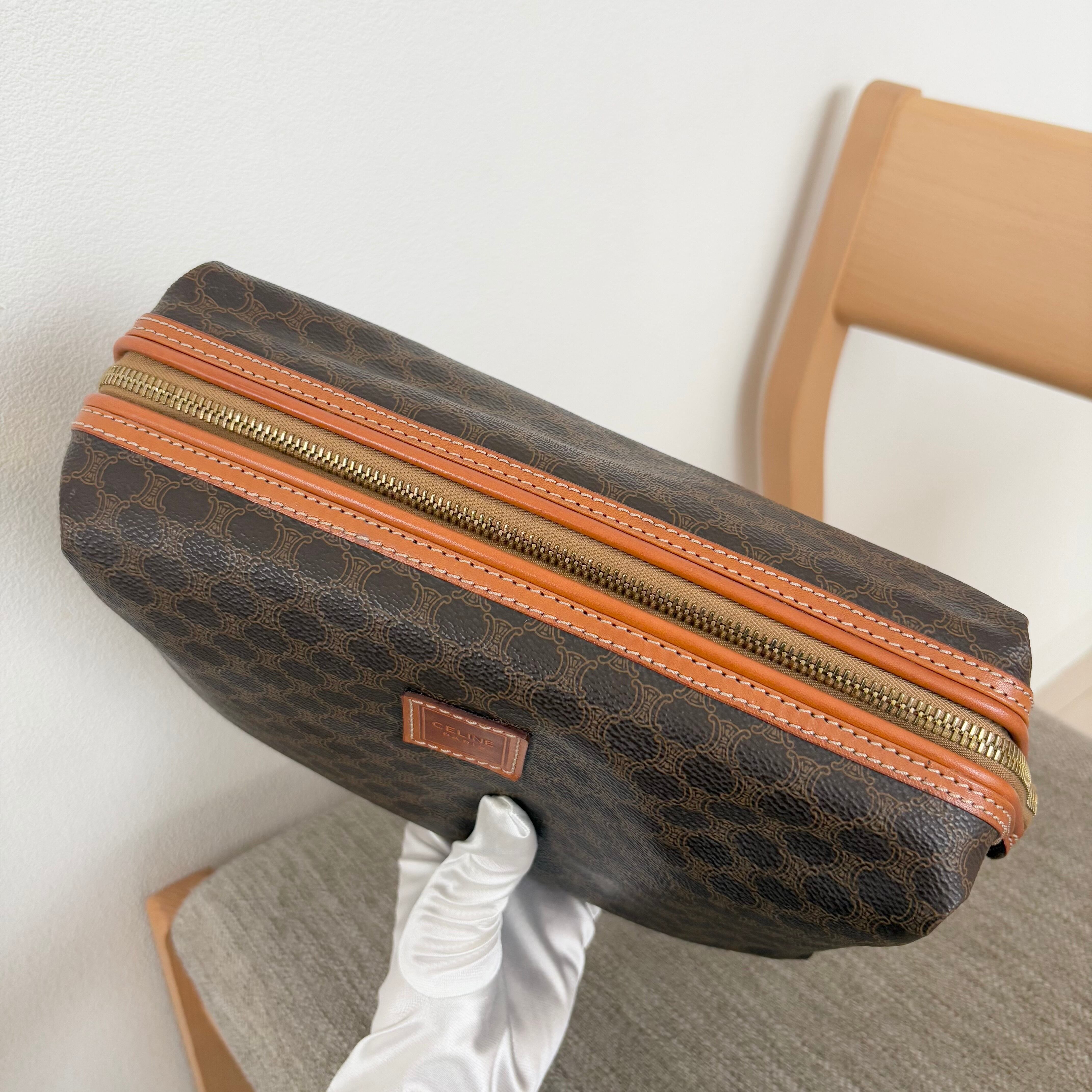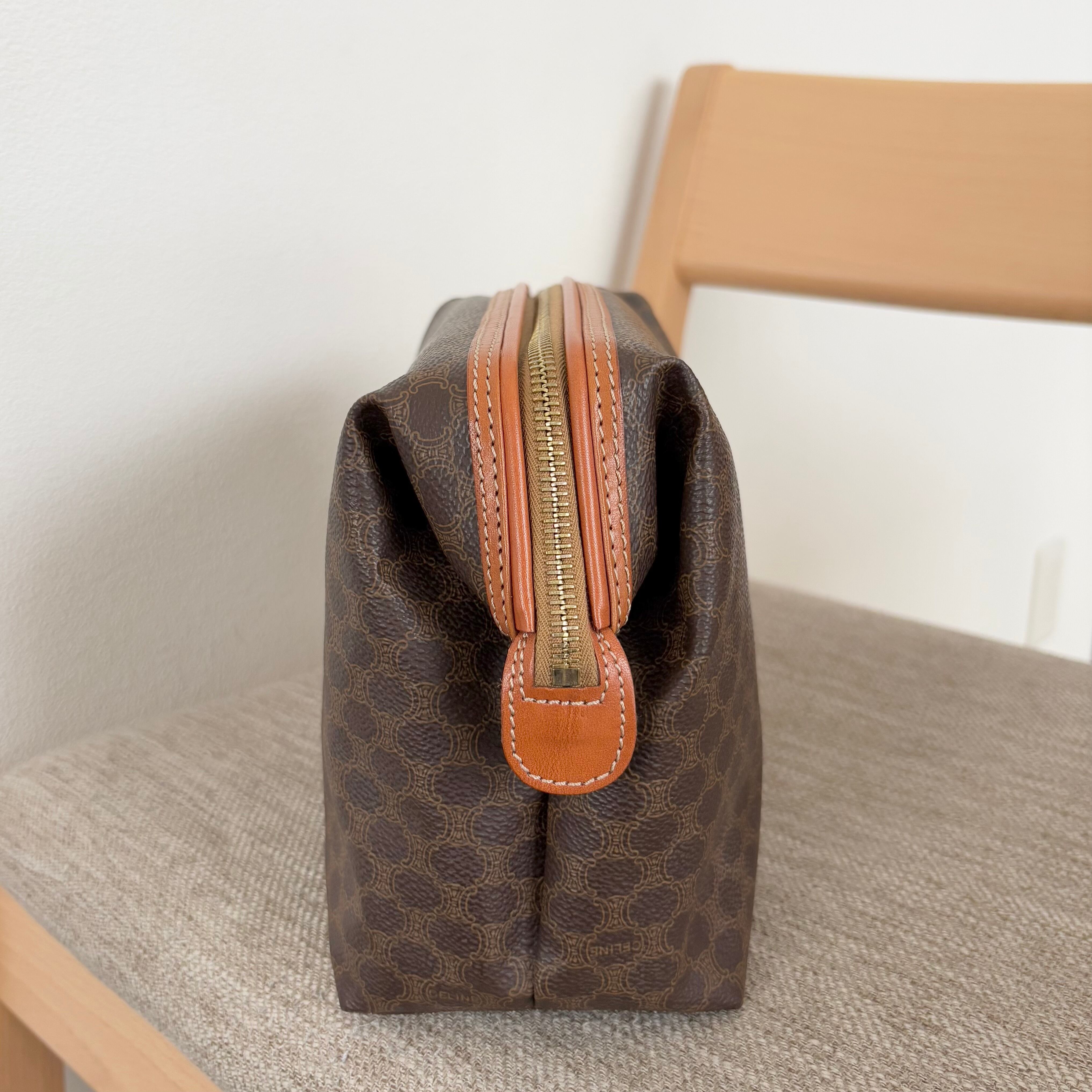 Celine セリーヌ マカダム コスメポーチ 小物入れ PVC カーフ レザー バック 本革 ショルダー バッグ ブラウン系 ゴールド金具 肩掛け かばん Celine Vintage Clutch Bag Pouch 22033 | Laiza