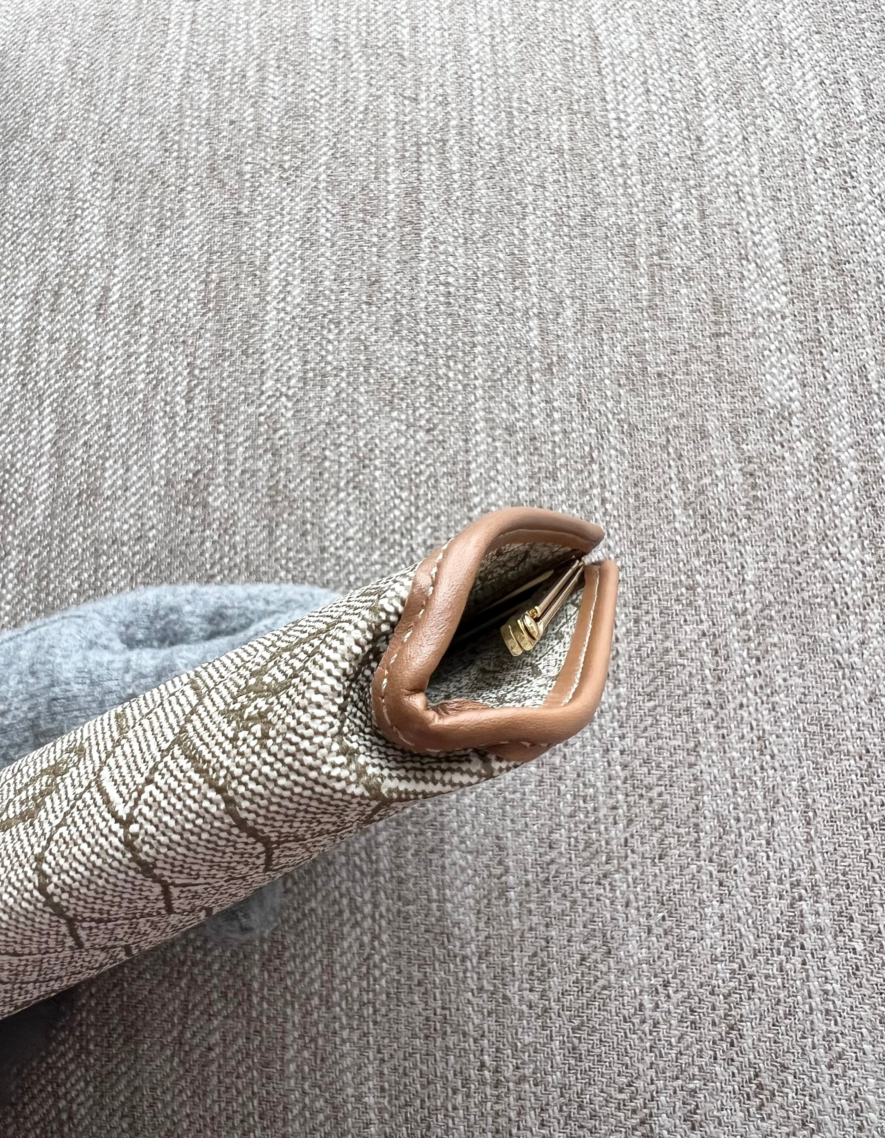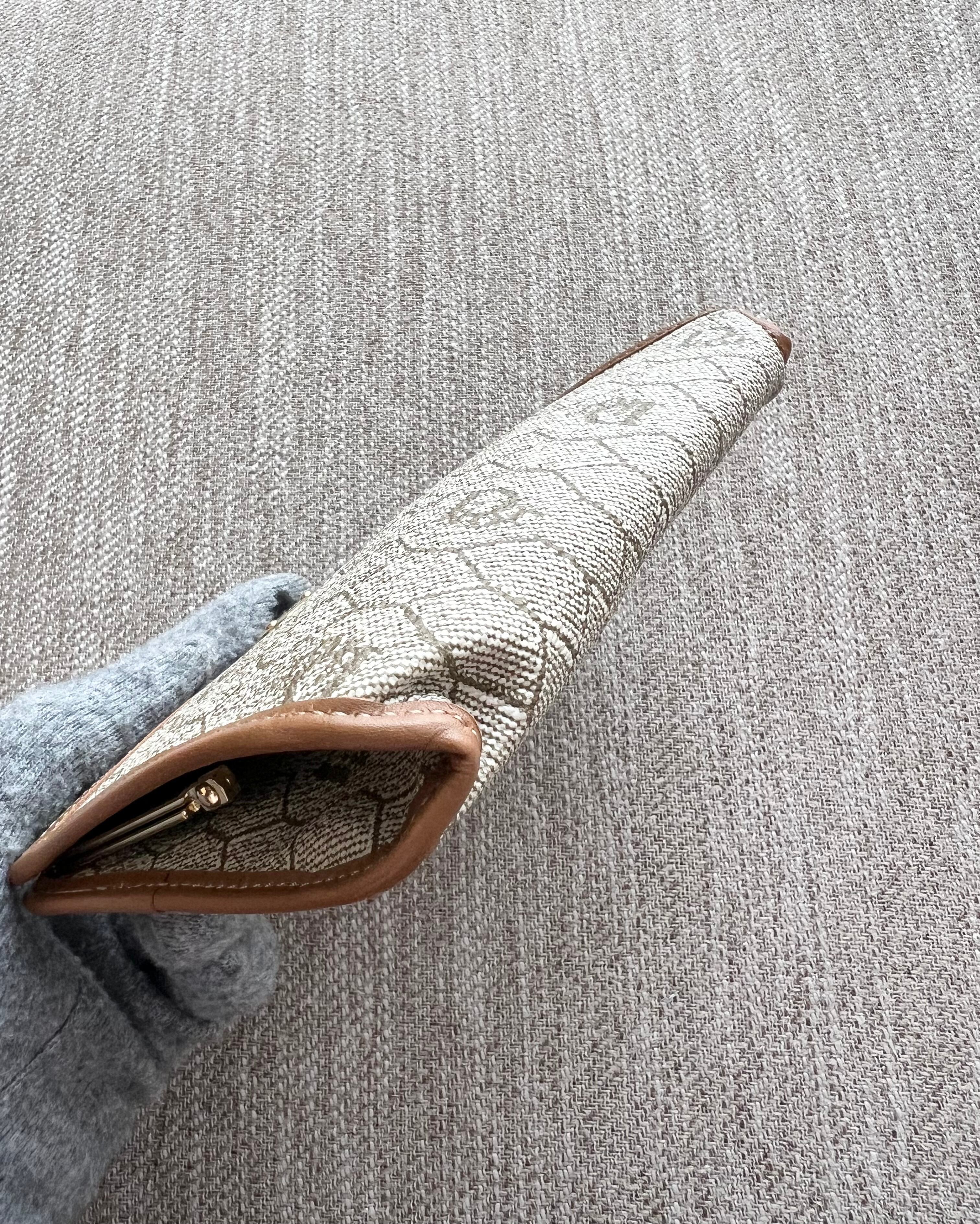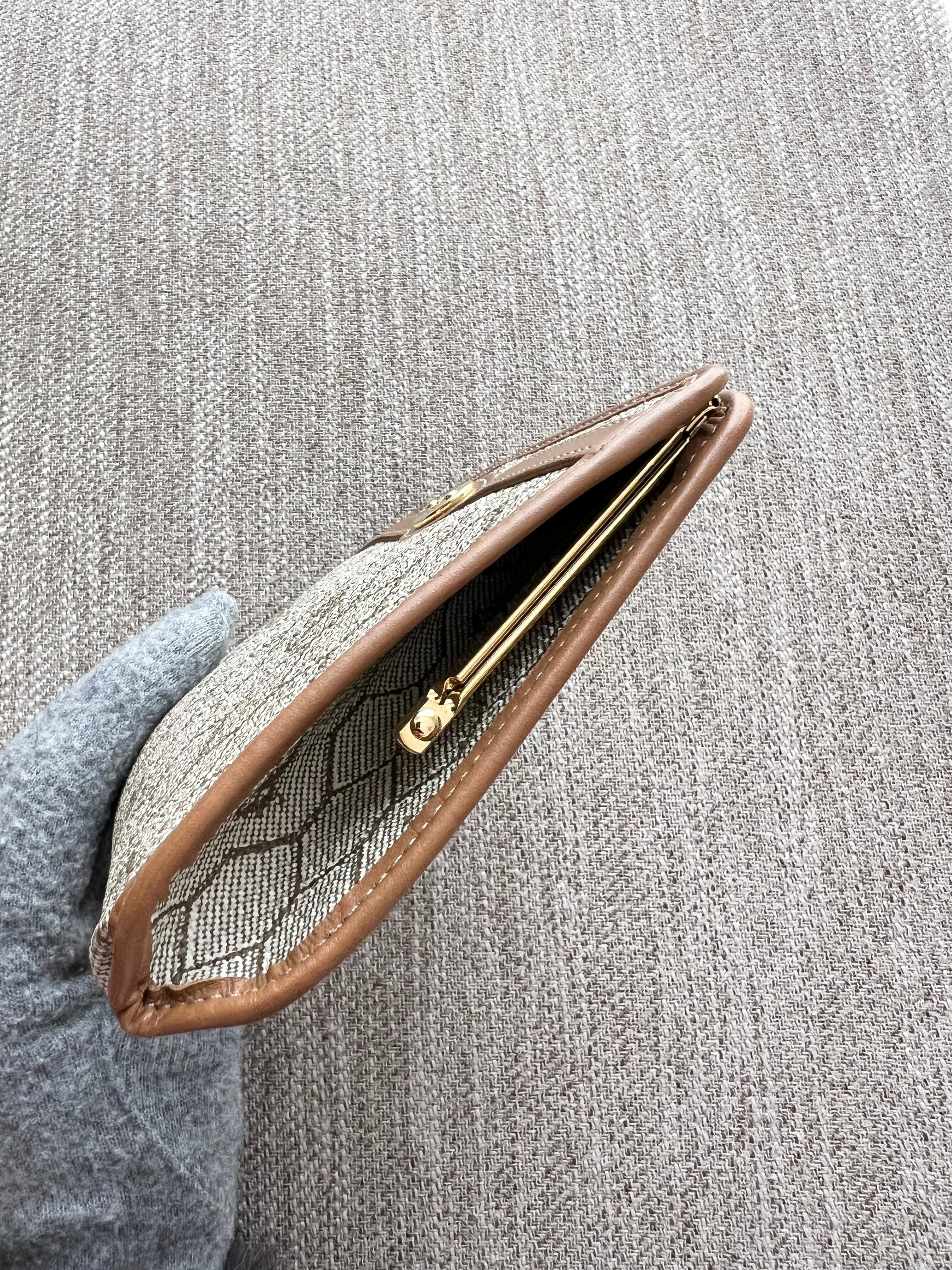 キリリと引き締まったカーキ系のキャンバス地に、ヴィンテージなハニカム柄が施された、Christian Dior(クリスチャンディオール)のがま口コインケース。一点物の中古品ですが、美しいデザインや手の込んだ細部までの手作りの質感が感じられる逸品です。小銭やカードをすっきり収納出来るサイズで、バッグの中を整理するのにも便利なアイテム。